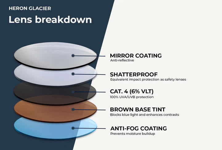 The Category 4 lenses feature a 5–7% VLT, reducing eye strain in intense light conditions. Their brown tint is ideal for snow by enhancing contrast and improving terrain visibility. An anti-fog coating prevents condensation during long ascents. Cut from 2mm polycarbonate, the lenses are shatterproof for maximum safety.